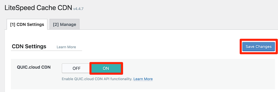 QUIC.cloud CDN. Glöm inte att spara inställningsändringen medSave Changes-knappen.