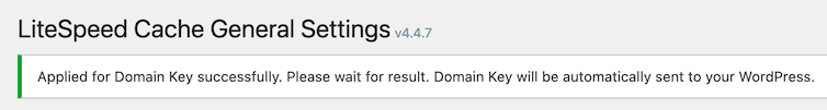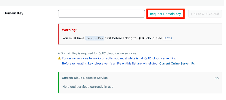 Request Domain Key, som du behöver klicka på för att generera den nyckel som kommer användas av QUIC.cloud för att sammankoppla din site med sin CDN-tjänst.