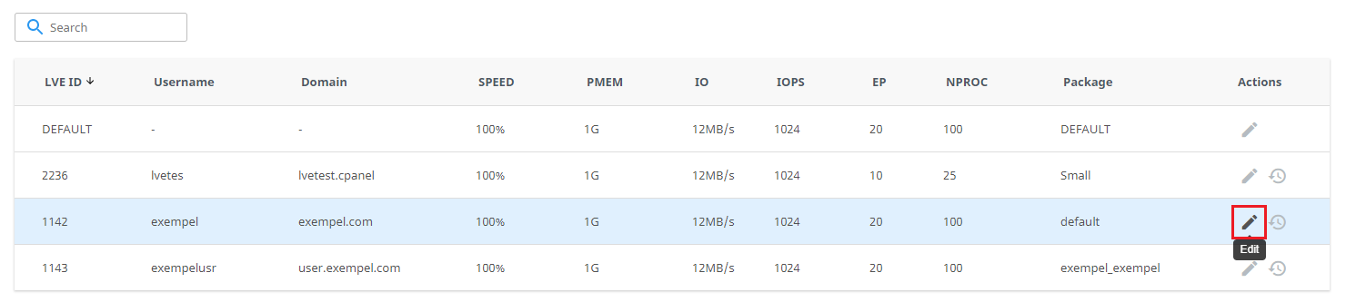 - Klicka på ikonen som ser ut som en penna vid det cPanelkonto som du vill ändra på. Ifall du har många underkonton så kan du använda sökrutan för att filtrera fram den du är ute efter.