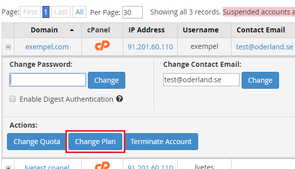 Det andra är att låta olika paket ha distinkta nivåer av resurser, då kan du istället växla paketet som ett cPanelkonto använder för att på så vis ändra kontots kapacitet. Detta har fördelen att det blir lättare att hantera flera konton.