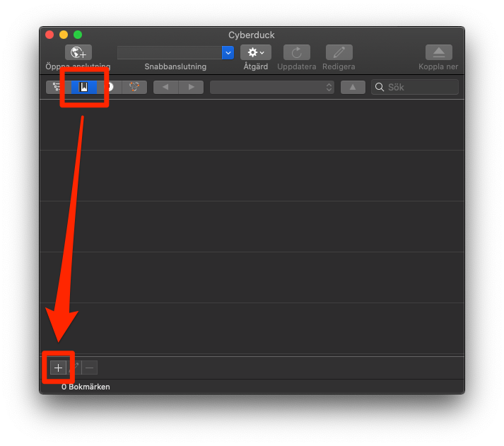 Efter du startat programmet, byt till bokmärkesfliken (ganska högt upp i programfönstret) och klicka sedan på + längst ner till vänster för att lägga till en ny anslutning.