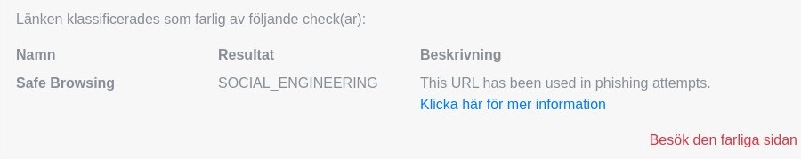 Om du klickar på frågetecknet i rutans nedre högra hörn får du information om varför blockeringen gjorts. Där hittar du även en länk för att besöka den farliga sidan om du mot förmodan önskar göra det.
