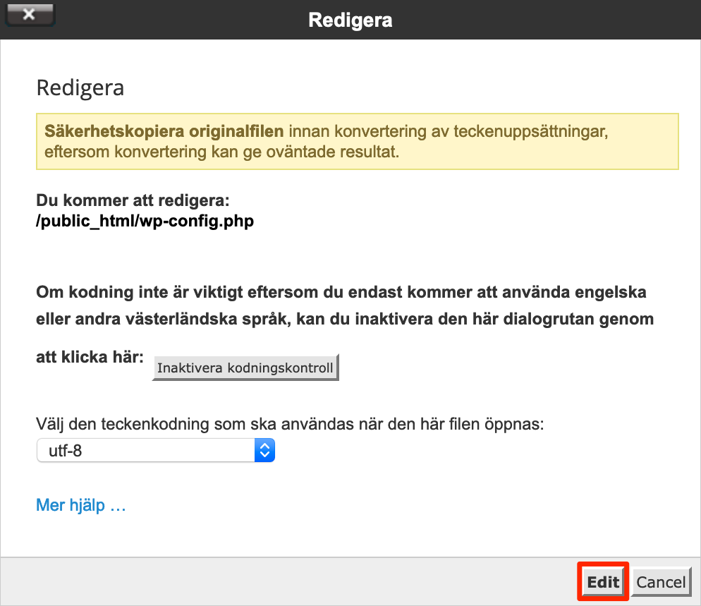 Edit-knappen längst ner. Om du använt någon annan teckenkodning när filen skapades (eller när du redigerat den tidigare), ändra från UTF-8 till rätt. Låt den vara kvar på UTF-8 om du inte vet att du uttryckligen använt något annat tidigare.