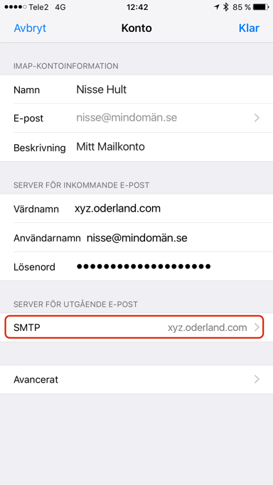 Serveradressen för utgående e-post är densamma som du har för inkommande e-post. Denna informationen har du fått via e-post då du köpte tjänsten och går att se när du loggar in på Kundavdelningen. Även användarnamnet och lösenordet ska vara desamma som för inkommande e-post. Du ska alltså inte skriva xyz.oderland.com, du behöver ersätta det med det riktiga servernamnet enligt instruktionerna här ovanför.