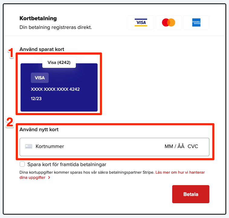 4. En bit ner på sidan väljer du Kortbetalning och klickar på ett kort du sparat hos oss sedan tidigare (1) eller så matar du in uppgifterna för ett nytt kort (2). Klicka på Betala-knappen när du är redo att betala.
