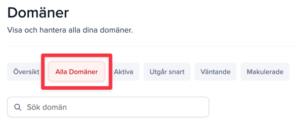 Du når nu hanteringssidan för domäner som hanteras via oss. Klicka på Alla Domäner överst för att se alla dina domännamn.