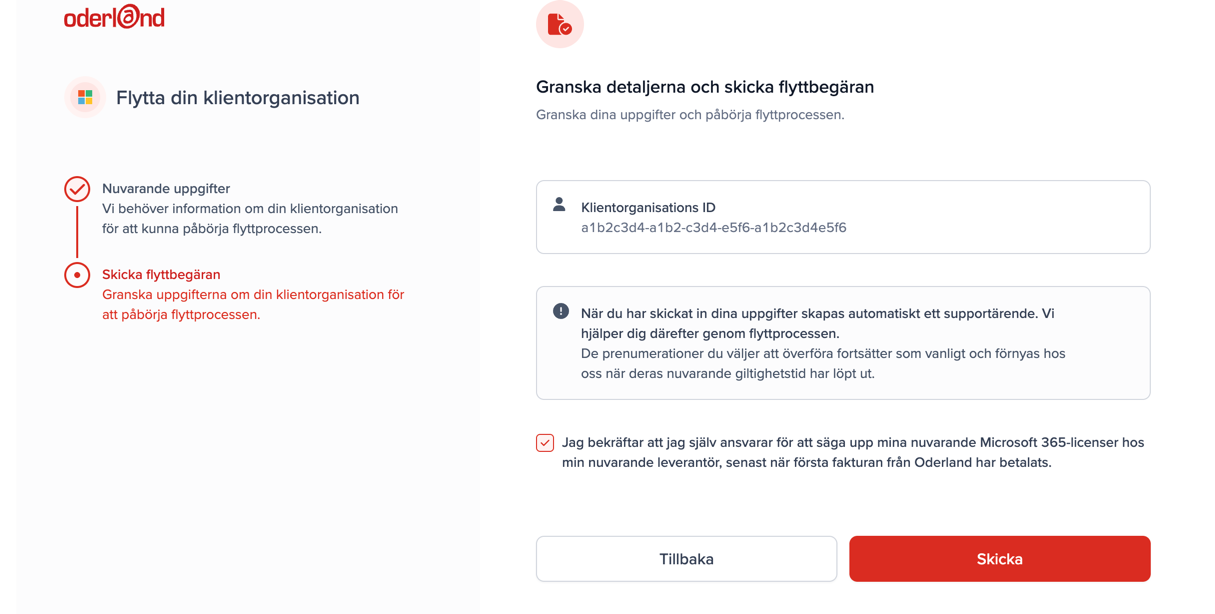 - Granska uppgifterna och om allt ser rätt ut. Glöm inte att kryssa i rutan om att du själv ansvarar för att säga upp nuvarande Microsoft 365-licenser hos den nuvarande leverantören. Klicka sedan på