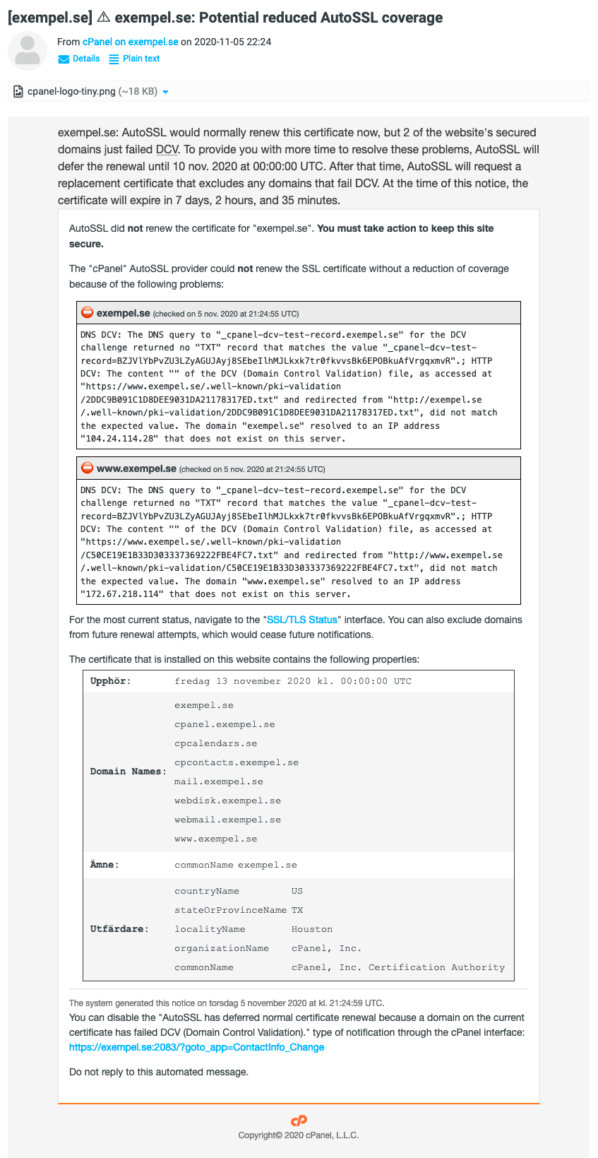 Om AutoSSL av någon anledning inte kan ordna ett certifikat för en domän eller underdomän kommer ett mail skickas ut till den mailadress som står angiven som kontaktadress inne på cPanel. Om man inte vill ha dessa mail går notifikationerna att stänga av inne på sidan om kontaktadress och notifikationer på cPanel (längst ner på den sidan).