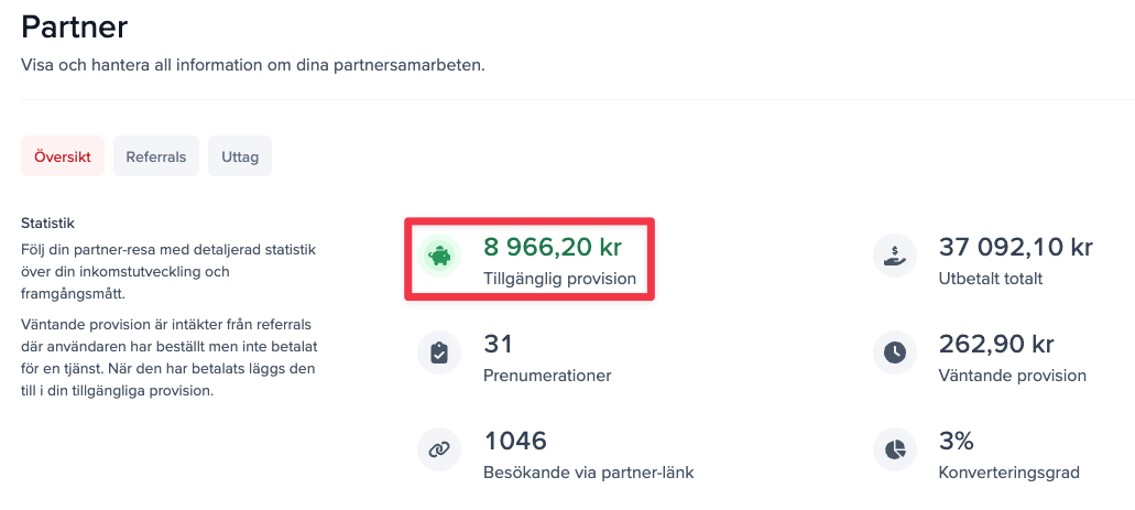- På sidan du landar på ser du en aktuell siffra på ditt provisionssaldo (vid
