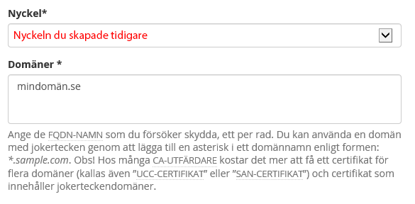 Hantera SSL-webbplatser. - Välj det domännamn du vill installera certifikatet på i drop-down menyn med rubriken