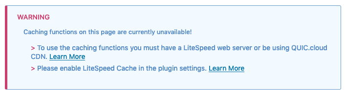 Om du klickar på LiteSpeed Cache i menyn till vänster inne på WordPress admin hittar du ett antal menyval, vilka vi kort förklarar här nedan.