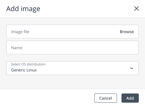 Browseför att söka upp avbildsfilen på din dator. Ge sedan avbilden ett namn iName-fältet samt välj den distributionskategori som passar bäst för avbilden du ska ladda upp vidSelect OS distribution. Klicka sedan påAdd-knappen.