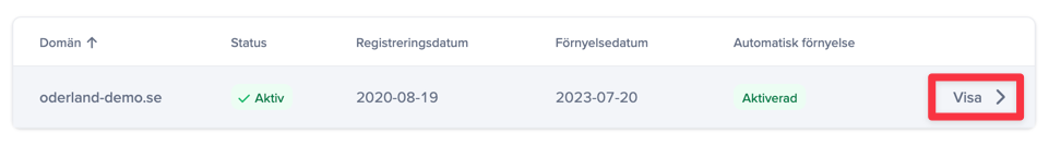 - Du kommer nu till en sida där de domäner som går att överlåta åtfinns överst. I den nedre tabellen kommer domäner som just nu inte går att överlåta finnas listade. Leta upp domänen du vill överlåta i den övre tabellen och klicka på knappen
