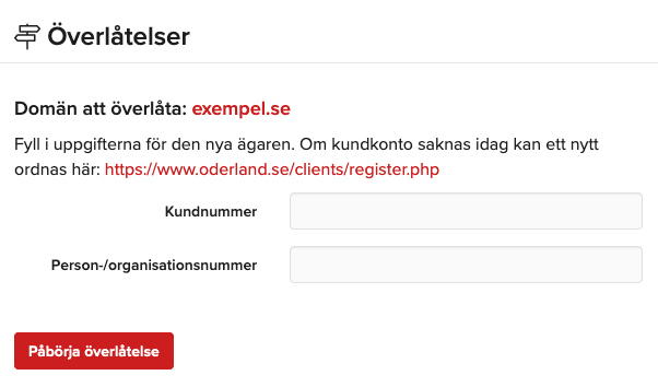 Efter den nya ägaren klickat på länken i mailet (efter eventuell inloggning in på Kundavdelningen) fås följande sida fram: