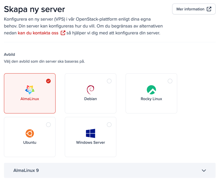 - På sidan du landar på får du nu välja operativsystem, systemresurser, diskutrymme, IP-adress och så vidare för din nya server. Du kan hela tiden se en uppskattning på vad servern kommer kosta per månad längst ner på sidan.