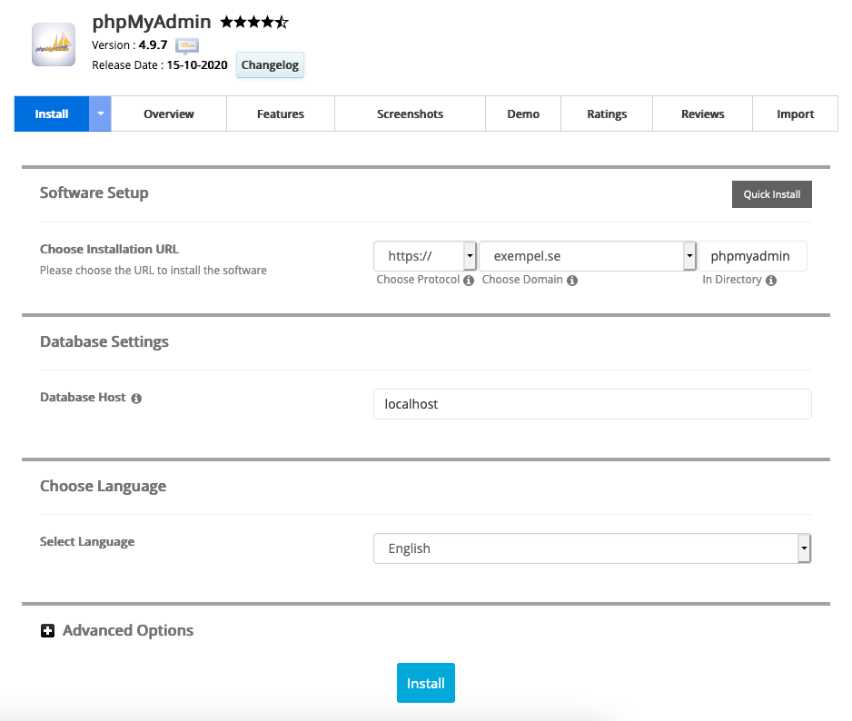Välj sedan vilken domän och mapp du vill att phpMyAdmin ska installeras i, klicka Install när du är klar. Database host ska vara localhost.