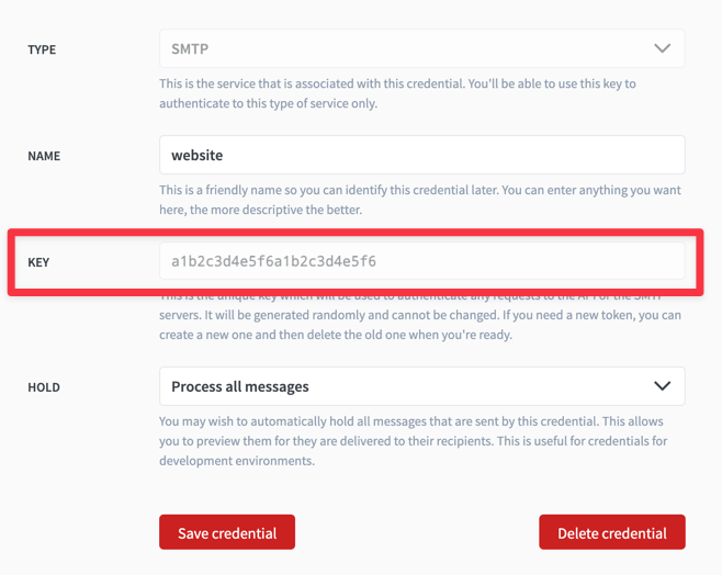 Hold: Låt denna stå kvar på ”Process all messages” om du vill att mail som skickas med inloggningsuppgifterna ska skickas ut till mottagarna. Väljer du ”Hold messages from this credential” kommer mailen lämnas över till Postal från din plattform/hemsida men inte skickas vidare till mottagaren.
