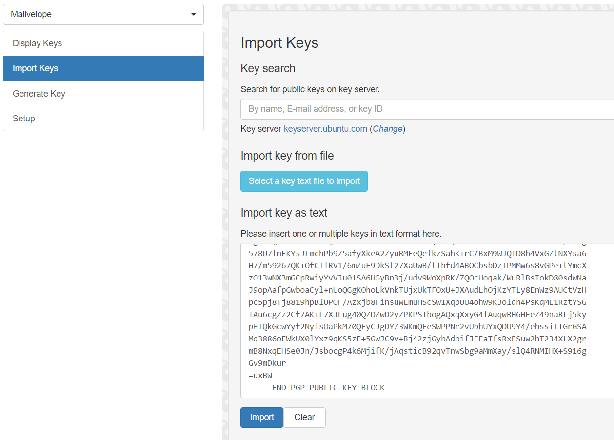 Nu tillbaka till Mailvelope, i menyn har du säkerligen sett valet Import Keys, klicka på den och klistra in texten du har kopierat sen tidigare. Efter att du har klickat på Submit kommer du kunna skicka krypterade mail till personen som äger den nyckeln.
