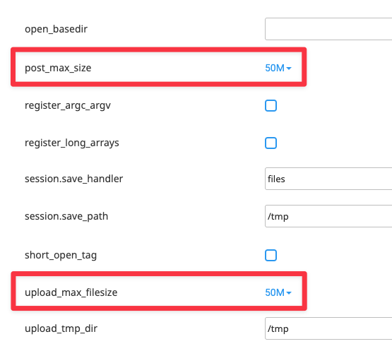De inställningar som är relevanta att ändra gällande uppladdning av filer är post_max_size samt upload_max_filesize.