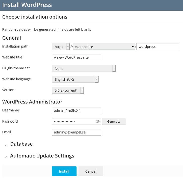 - Version: Here you can specify what version of WordPress to install. If you don’t know that you need a certain version due to requirements from a theme or plugin, we recommend that you use the latest version.