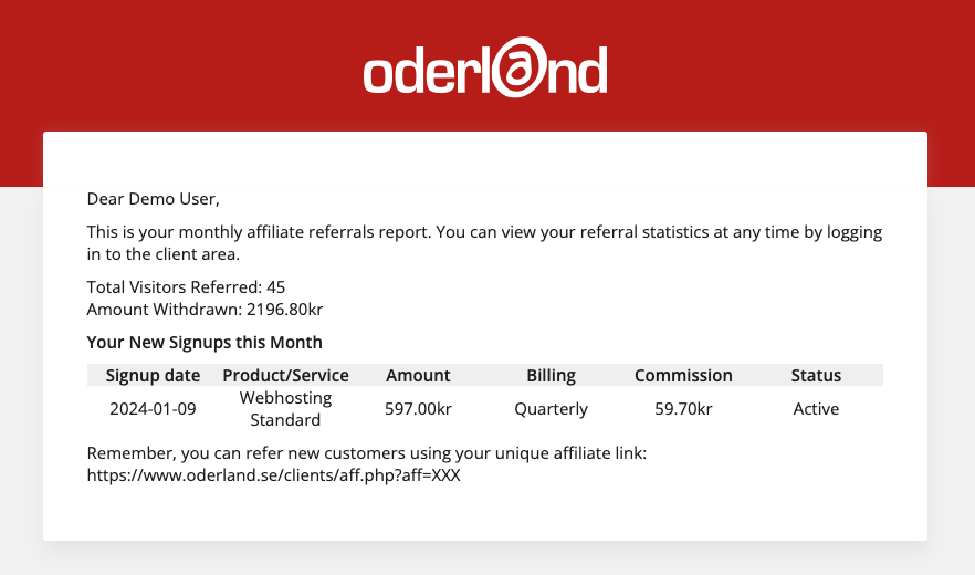 To collect commissions, be sure to share your unique affiliate link (see below) with everyone you want to tell about us. Every time someone places an order with us after surfing to our website via your link, the order will be linked to your partner account with us and you can start receiving kickback on invoices paid by the customer (not applicable to start-up fees, domain names, Oderland Cloud, Microsoft 365 licenses, or upgrade orders).